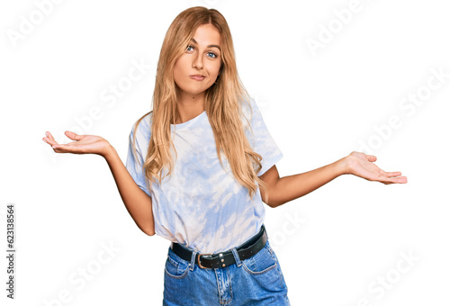 Beautiful blonde young woman wearing casual tie dye shirt clueless and confused expression with arms and hands raised. doubt concept.