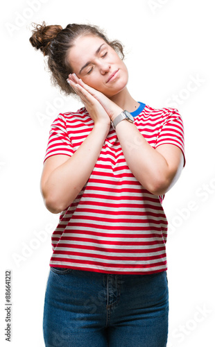 Beautiful brunette curly hair young girl wearing casual look over isolated background sleeping tired dreaming and posing with hands together while smiling with closed eyes.