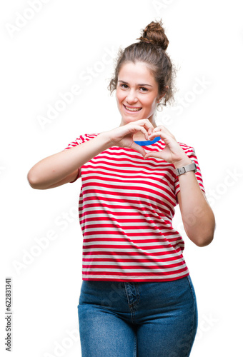 Beautiful brunette curly hair young girl wearing casual look over isolated background smiling in love showing heart symbol and shape with hands. Romantic concept.