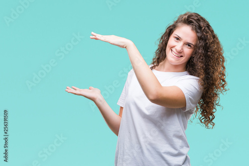 Beautiful brunette curly hair young girl wearing casual t-shirt over isolated background gesturing with hands showing big and large size sign, measure symbol. Smiling looking at the camera