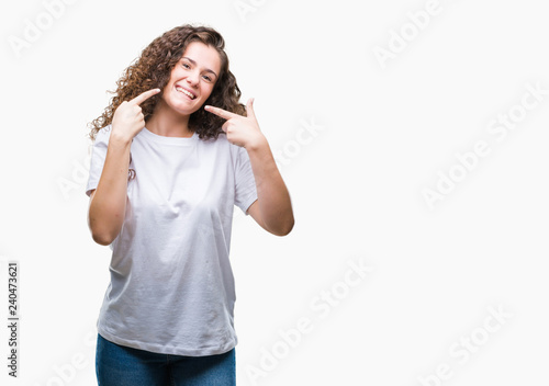 Beautiful brunette curly hair young girl wearing casual t-shirt over isolated background smiling confident showing and pointing with fingers teeth and mouth. Health concept.