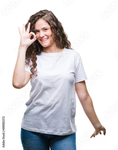 Beautiful brunette curly hair young girl wearing casual t-shirt over isolated background smiling positive doing ok sign with hand and fingers. Successful expression.