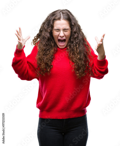 Beautiful brunette curly hair young girl wearing glasses and winter sweater over isolated background celebrating mad and crazy for success with arms raised and closed eyes screaming excited