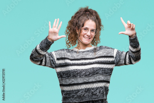 Beautiful brunette curly hair young girl wearing glasses over isolated background showing and pointing up with fingers number seven while smiling confident and happy.