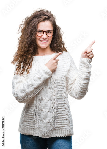 Beautiful brunette curly hair young girl wearing winter sweater over isolated background smiling and looking at the camera pointing with two hands and fingers to the side.