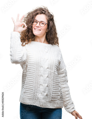 Beautiful brunette curly hair young girl wearing winter sweater over isolated background smiling positive doing ok sign with hand and fingers. Successful expression.