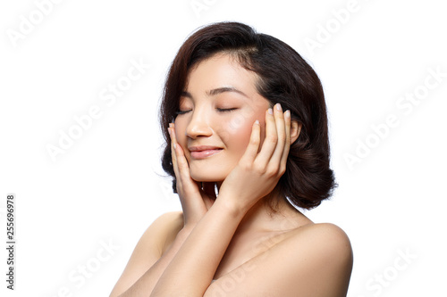 beautiful brunette girl with natural makeup isolated on white