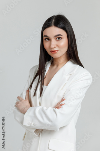 Beautiful brunette model wearing white business suit smiling and looking at camera