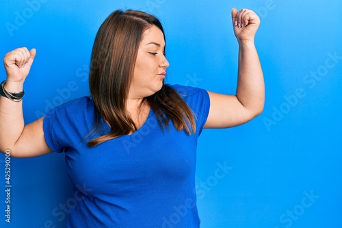 Beautiful brunette plus size woman wearing casual blue t shirt showing arms muscles smiling proud. fitness concept.