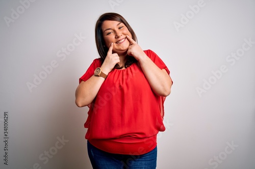 Beautiful brunette plus size woman wearing casual red t-shirt over isolated white background Smiling with open mouth, fingers pointing and forcing cheerful smile