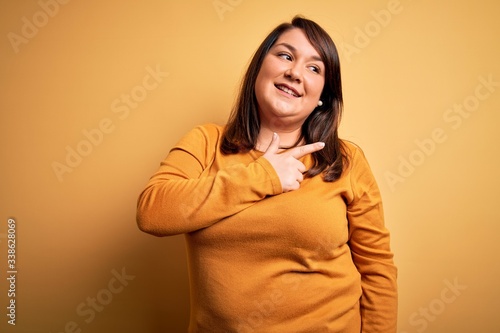 Beautiful brunette plus size woman wearing casual sweater over isolated yellow background cheerful with a smile on face pointing with hand and finger up to the side with happy and natural expression