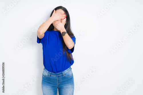 Beautiful brunette woman over isolated background Covering eyes and mouth with hands, surprised and shocked. Hiding emotion