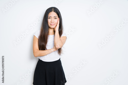 Beautiful brunette woman over isolated background thinking looking tired and bored with depression problems with crossed arms.