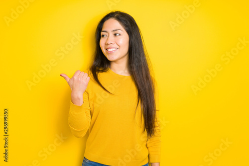 Beautiful brunette woman over yellow isolated background smiling with happy face looking and pointing to the side with thumb up.