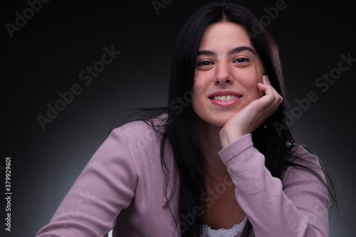 beautiful brunette woman smiling, studio light, neutral background
