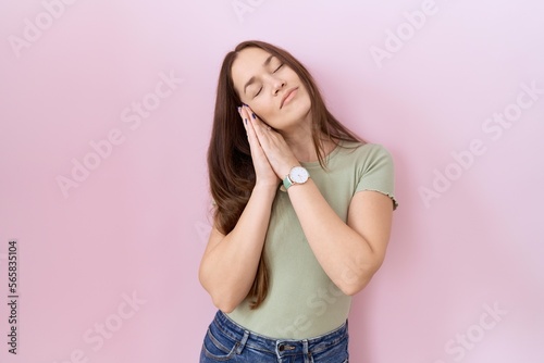 Beautiful brunette woman standing over pink background sleeping tired dreaming and posing with hands together while smiling with closed eyes.