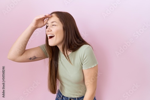Beautiful brunette woman standing over pink background very happy and smiling looking far away with hand over head. searching concept.
