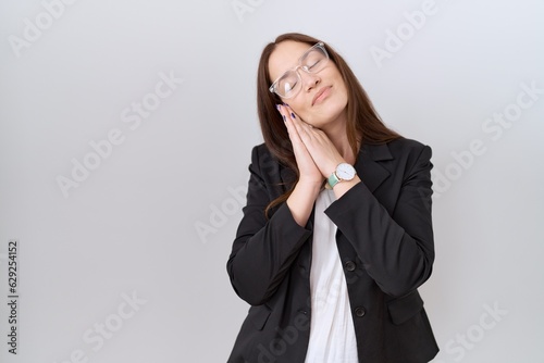 Beautiful brunette woman wearing business jacket and glasses sleeping tired dreaming and posing with hands together while smiling with closed eyes.