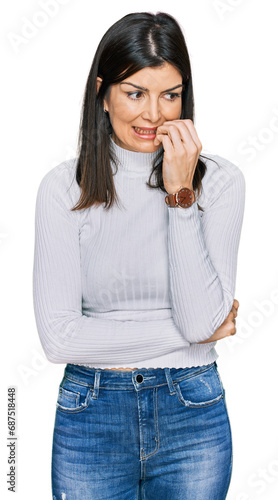 Beautiful brunette woman wearing casual clothes looking stressed and nervous with hands on mouth biting nails. anxiety problem.
