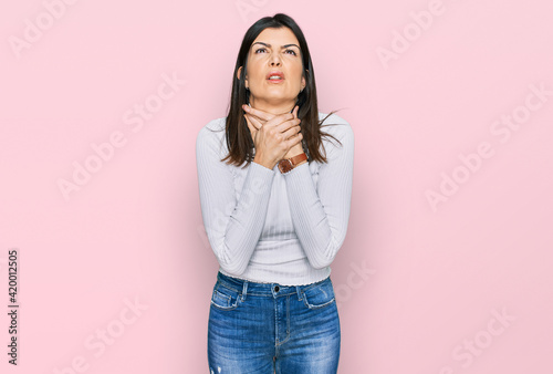 Beautiful brunette woman wearing casual clothes shouting suffocate because painful strangle. health problem. asphyxiate and suicide concept.