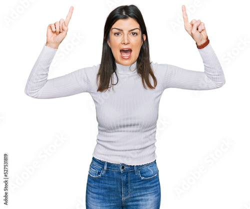Beautiful brunette woman wearing casual clothes smiling amazed and surprised and pointing up with fingers and raised arms.