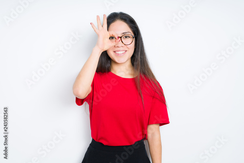 Beautiful brunette woman wearing glasses over isolated background doing ok gesture with hand smiling, eye looking through fingers with happy face.