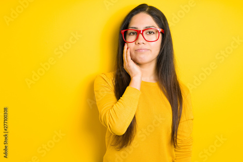 Beautiful brunette woman wearing red glasses over yellow isolated background thinking looking tired and bored with depression problems with crossed arms.