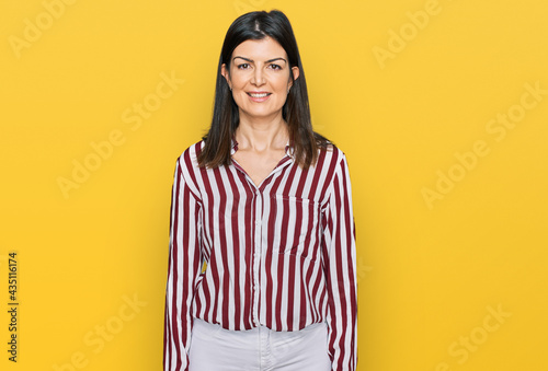 Beautiful brunette woman wearing striped shirt with a happy and cool smile on face. lucky person.