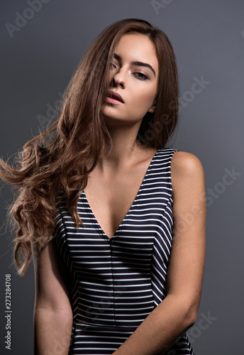 Beautiful brunette woman with long curly hair style and natural nude makeup looking on grey background. Сloseup