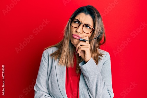 Beautiful brunette woman working at the office wearing operator headset serious face thinking about question with hand on chin, thoughtful about confusing idea