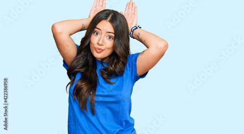 Beautiful brunette young woman wearing casual clothes doing bunny ears gesture with hands palms looking cynical and skeptical. easter rabbit concept.