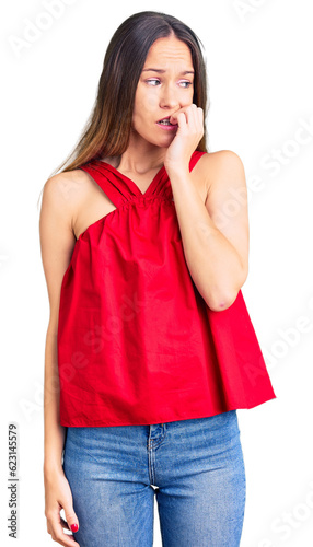 Beautiful brunette young woman wearing casual clothes looking stressed and nervous with hands on mouth biting nails. anxiety problem.