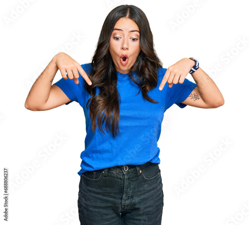 Beautiful brunette young woman wearing casual clothes pointing down with fingers showing advertisement, surprised face and open mouth