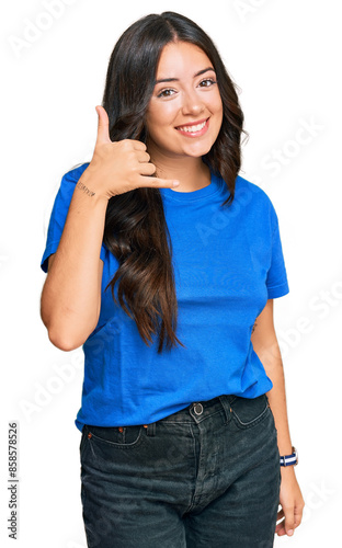 Beautiful brunette young woman wearing casual clothes smiling doing phone gesture with hand and fingers like talking on the telephone. communicating concepts.