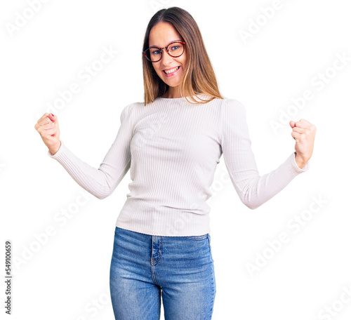 Beautiful brunette young woman wearing casual white sweater and glasses very happy and excited doing winner gesture with arms raised, smiling and screaming for success. celebration concept.