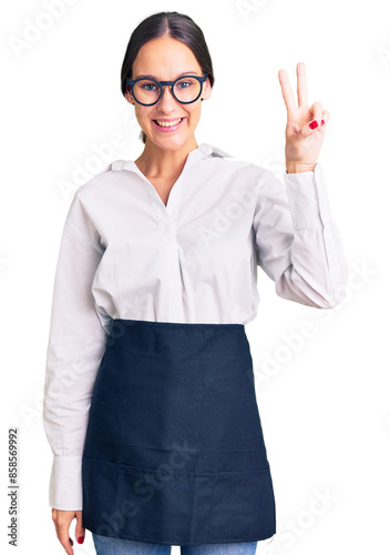 Beautiful brunette young woman wearing professional waitress apron smiling looking to the camera showing fingers doing victory sign. number two.