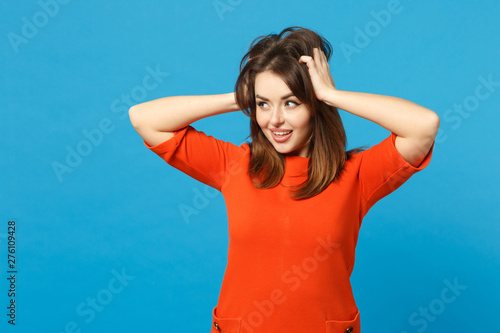 Beautiful brunette young woman wearing red orange dress put hands on head standing posing isolated over trendy blue background, studio portrait. People lifestyle fashion concept. Mock up copy space.