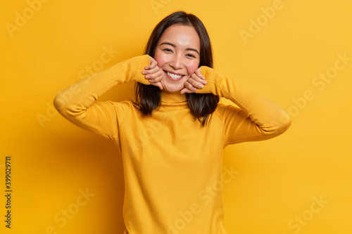 Beautiful brunette young woman with toothy smile keeps hands on cheeks stands satisfied indoor wears casual jumper poses against vivid yellow background. People youth positive emotions concept