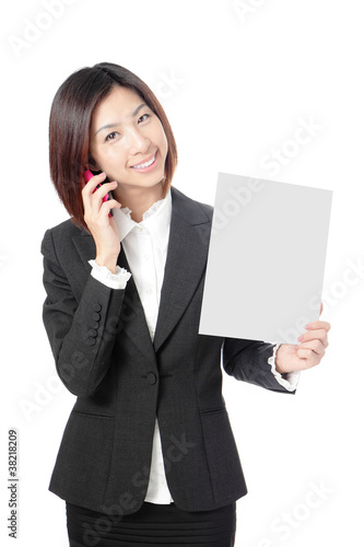 Beautiful Business woman take blank paper and speaking phone