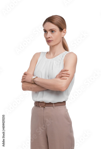 Beautiful businesswoman crossing arms on white background