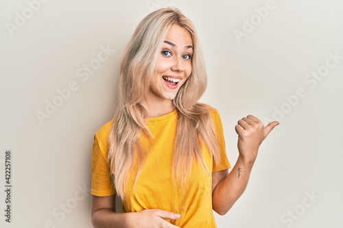 Beautiful caucasian blonde girl wearing casual tshirt smiling with happy face looking and pointing to the side with thumb up.
