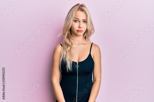 Beautiful caucasian blonde girl wearing sexy party dress depressed and worry for distress, crying angry and afraid. sad expression.