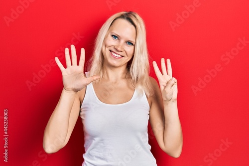 Beautiful caucasian blonde woman wearing casual white t shirt showing and pointing up with fingers number eight while smiling confident and happy.