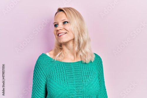 Beautiful caucasian blonde woman wearing casual winter sweater looking to side, relax profile pose with natural face and confident smile.