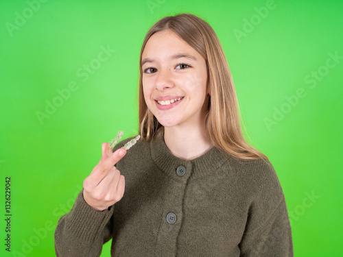 beautiful caucasian girl wearing green sweater holding an invisible aligner ready to use it. Dental healthcare and confidence concept.