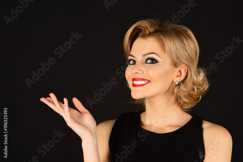 Beautiful caucasian girl with perfect skin and makeup. Ideal face of blonde, isolated on black background. Beauty, cosmetics and health care concept. Care and hair products. Copy space on open palm.