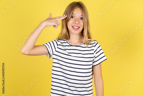 Beautiful caucasian kid girl wearing striped T-shirt foolishness around shoots in temple with fingers makes suicide gesture. Funny model makes finger gun pistol