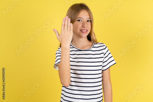 Beautiful caucasian kid girl wearing striped T-shirt smiling and looking friendly, showing number five or fifth with hand forward, counting down
