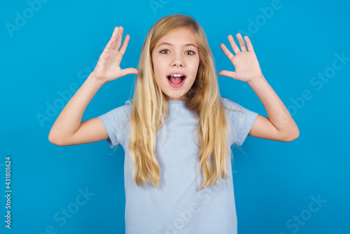 beautiful Caucasian little girl wearing blue T-shirt over blue background looks with excitement at camera, keeps hands raised over head, notices something unexpected, reacts on sudden news.