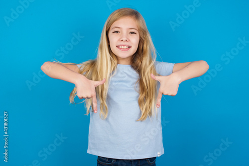 beautiful Caucasian little girl wearing blue T-shirt over blue background with positive expression, points down with both index fingers, has broad interested smile. Look there, please.